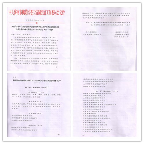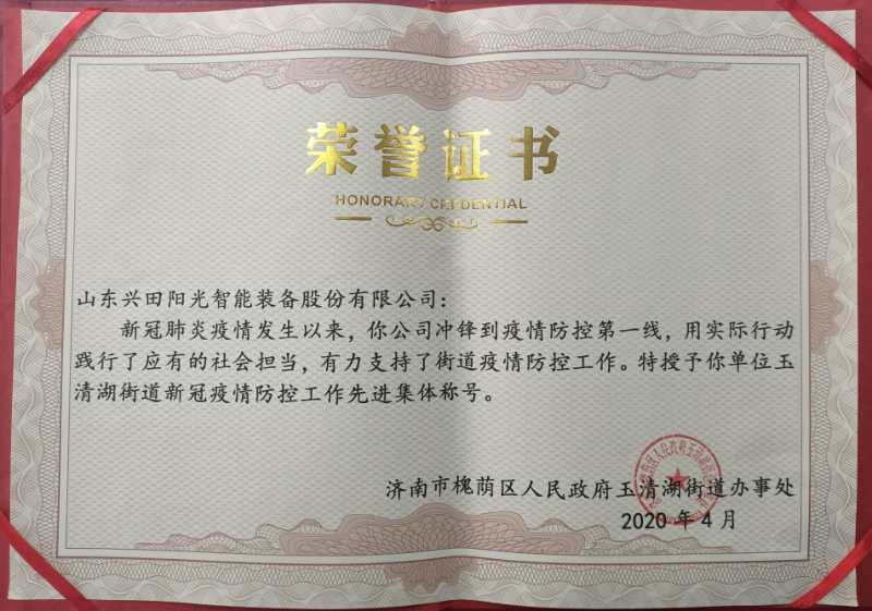 我公司——山东兴田阳光智能装备股份有限公司,因在新冠肺炎疫情防控工作中表现突出,被槐荫区玉清湖街道评为“新冠肺炎疫情防控工作表现突出的先进集体”,并被授予“抗‘疫’先锋团队”荣誉称号。