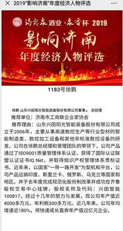 热烈祝贺我公司徐鹏总经理入围2019“影响济南”年度经济人物候选人。