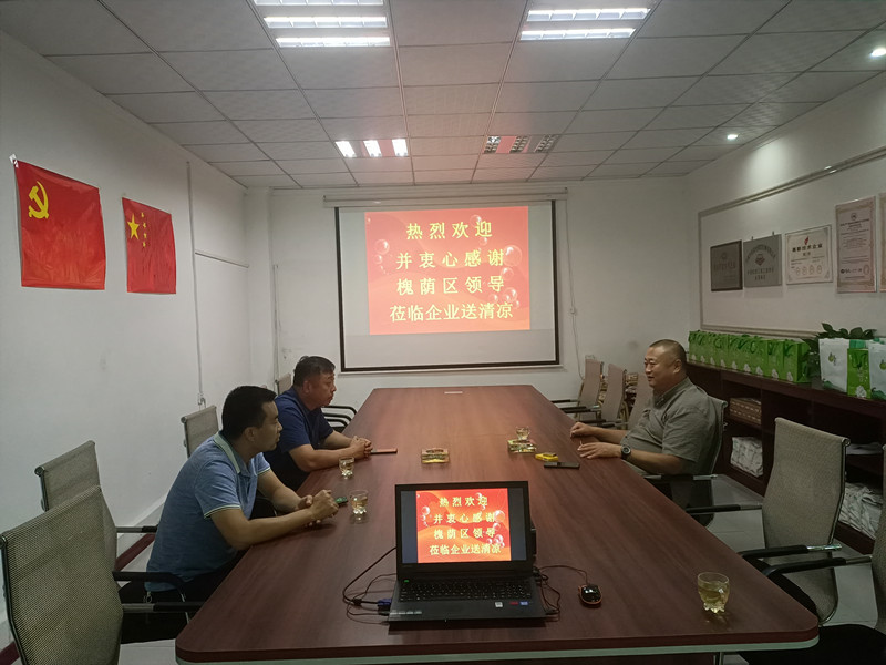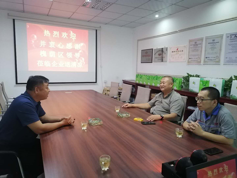 8月19日上午,受槐荫区领导委托,槐荫区工信局副局长惠健一行莅临公司进行夏季送清凉活动。公司董事长徐福厚、董事会秘书兼办公室主任王德华热情接待了惠健副局长一行。