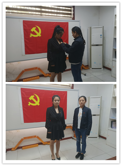 入党介绍人徐艳同志为预备党员梁世芳同志佩戴党徽。