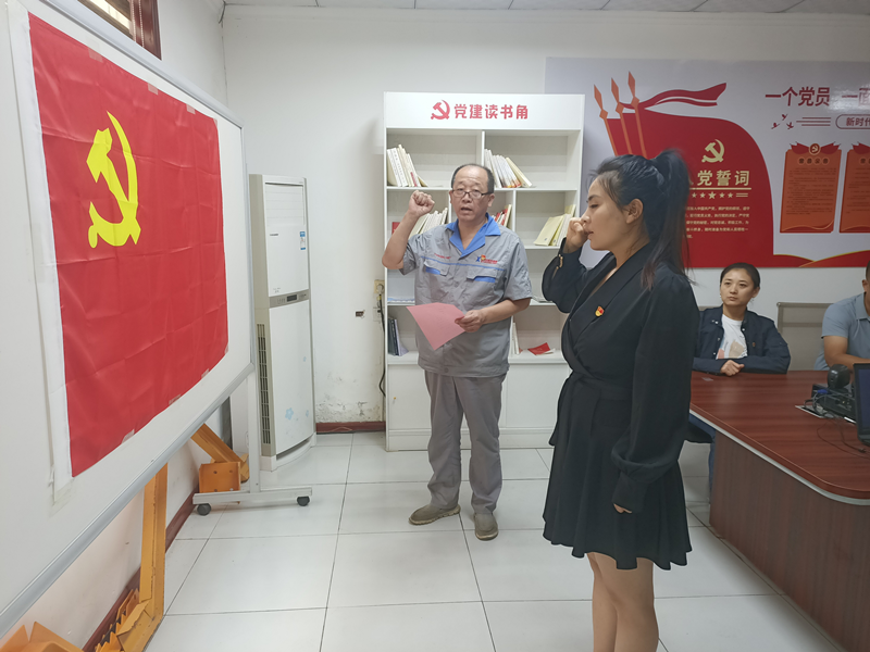 随后,预备党员梁世芳同志面对鲜红的党旗,在领誓人、支部书记孔祥健同志的带领下庄严宣誓,表达了对党的无限忠诚与热爱。
