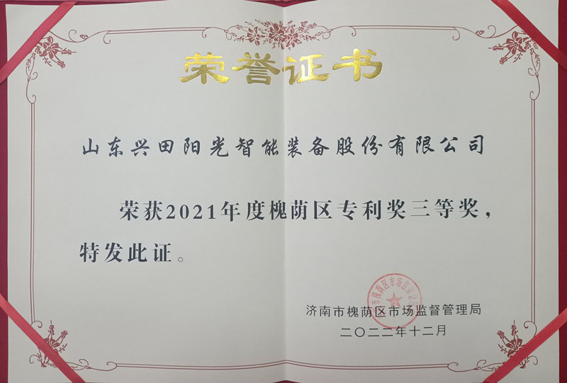 近日,经济南市槐荫区专利奖评审委员会评审,山东兴田阳光智能装备股份有限公司荣获2021年度槐荫区专利奖三等奖。